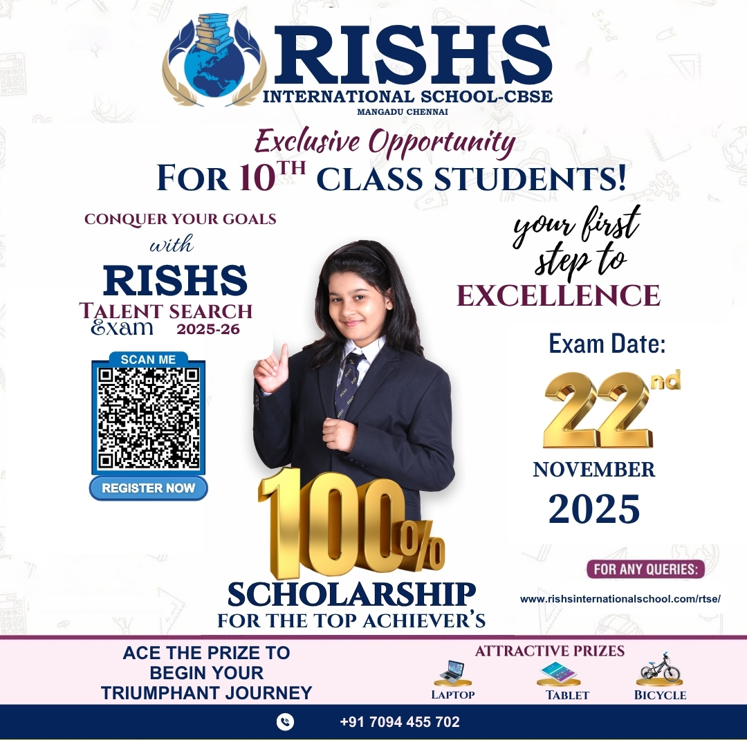 🎯 Exclusive Opportunity for Class 10 Students! 🎯Rishs International School presents the Talent Search Exam 2025 — a golden chance to showcase your skills and shine bright! 🌟 📅 Exam Date: 22nd November 2025🏆 Rewards: 100% Scholarship for Top Achievers!🎓 Unlock your potential and take